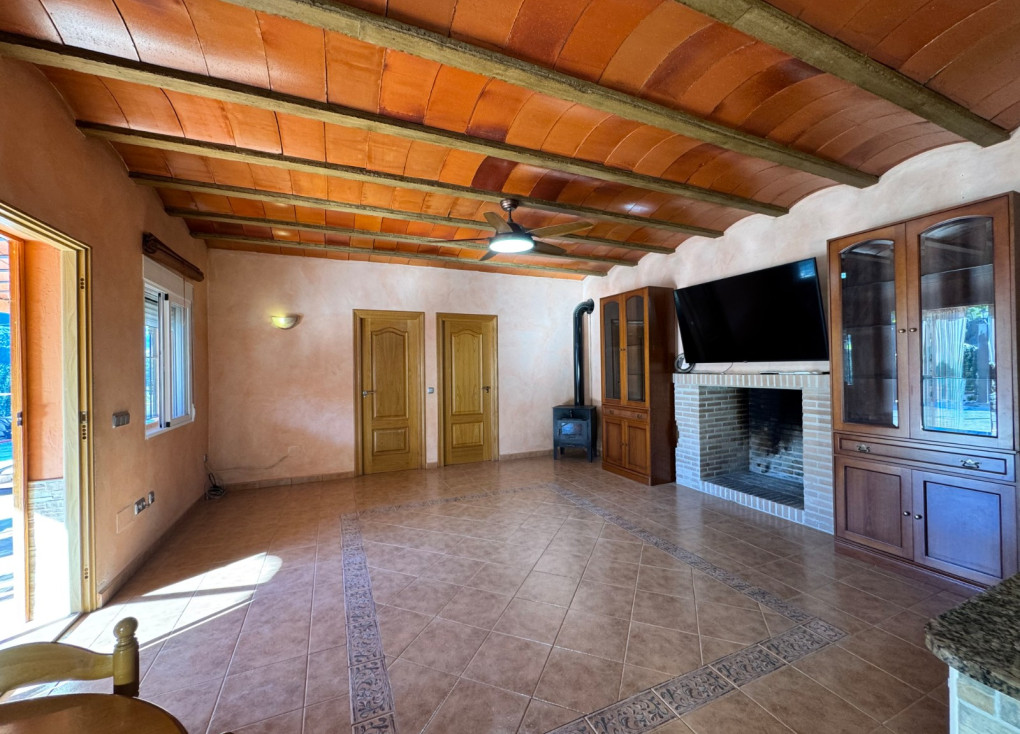 Desde el porche se accede a un amplio salón-comedor de concepto abierto, equipado con ventilador de techo, gran televisión de pantalla plana montada en la pared, chimenea decorativa con estufa de leña y aire acondicionado. La cocina, de estilo americano y también de concepto abierto, cuenta con una amplia barra de granito, electrodomésticos incluidos, sistema de ósmosis para agua potable y termo eléctrico.