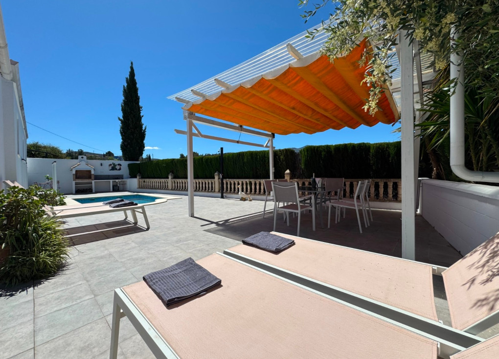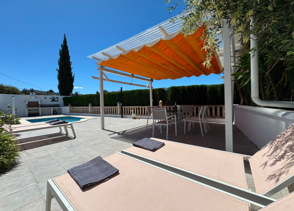 L’incroyable terrasse avant offre un grand porche pergola avec une couverture rétractable, une table à manger et des chaises, ainsi qu’un authentique barbecue espagnol avec des espaces de préparation et un évier avec eau chaude et froide.