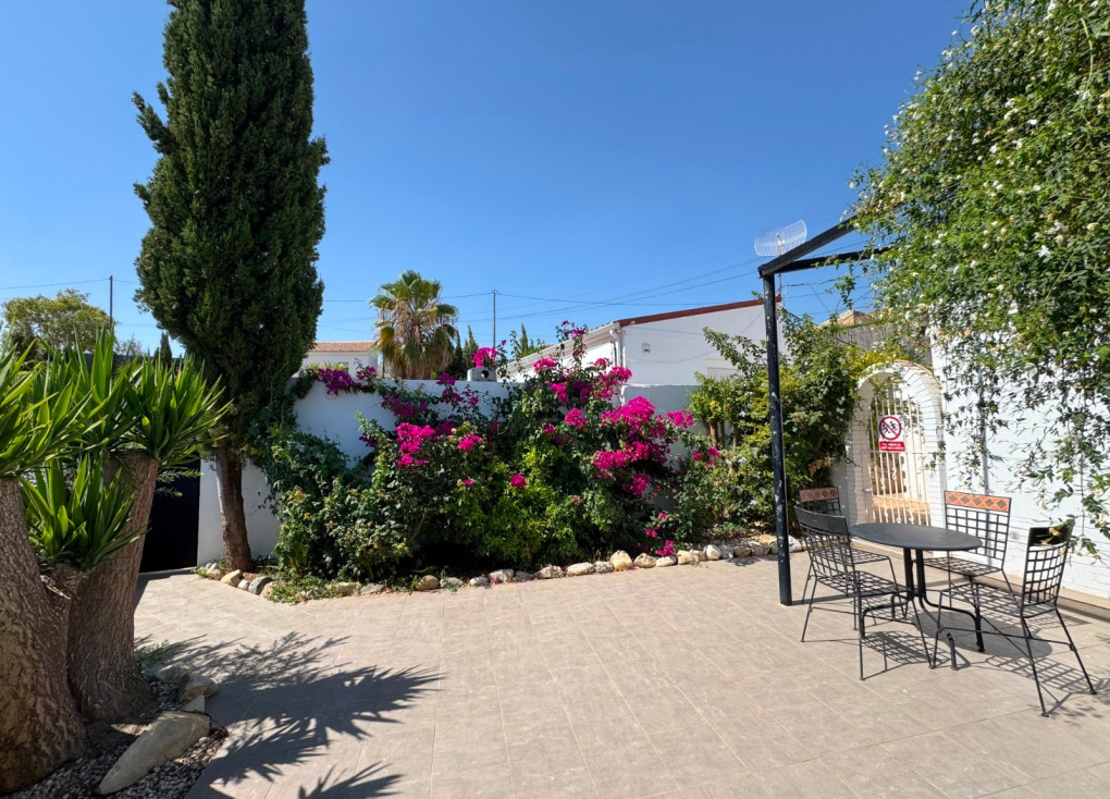 This spectacular detached villa, all ground floor, approximately140m2 set in its own private plot of 433m2 with private gated entry and boundaries fenced, and very private surrounded by mature palms, plants and shrubs provide an idyllic all year around setting for permanent residence, holidays or vacation rentals. For sale fully furnished as it is shown in the marketing photos and video etc.