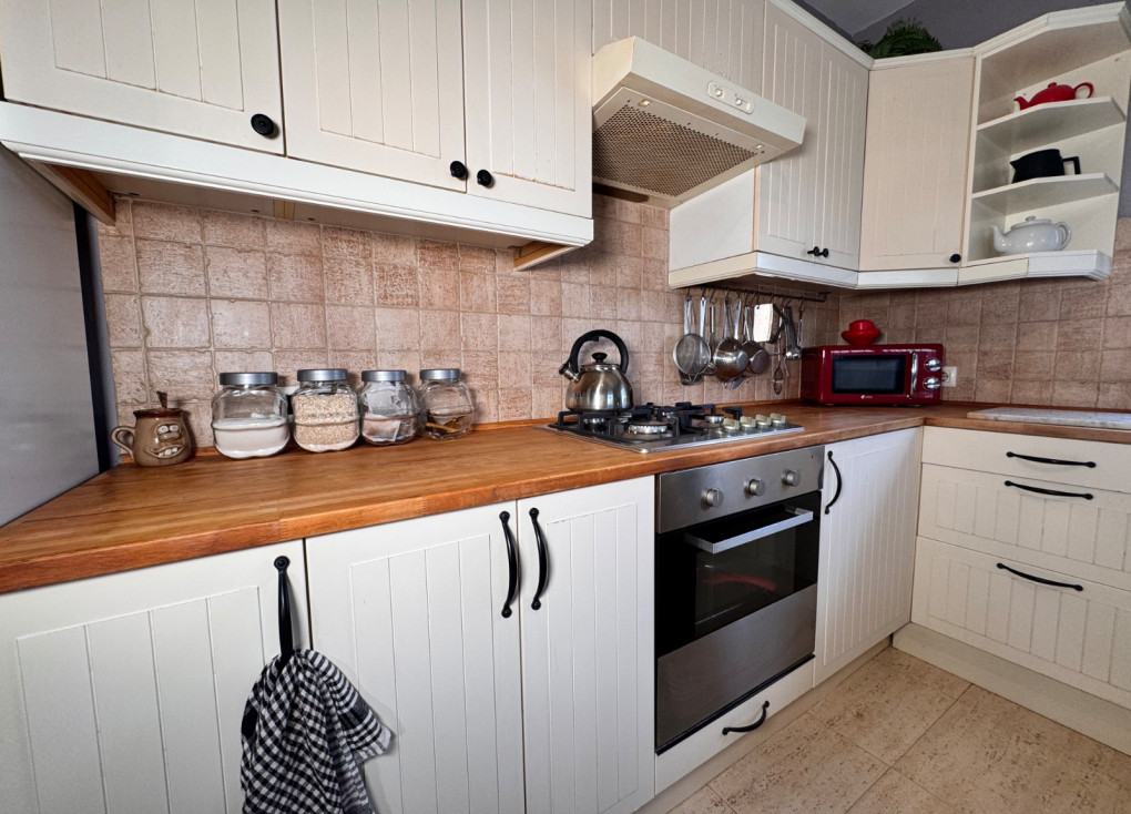 The house features three bedrooms, perfect for hosting friends or family. The two bathrooms include both a shower and one with a bathtub, ensuring convenience for everyone. The independent kitchen is fully fitted, generously sized and complete with a dining area.